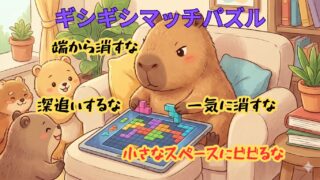 10時間プレイしてわかったギシギシマッチパズル攻略の正解。3,500点突破の証拠画像と共に「たくさん消さない」「内側から消す」など、運要素を排除するアルゴリズムを解説します。4,500点以降は泥沼注意!効率よく撤退してトータル収支を最大化しましょう
