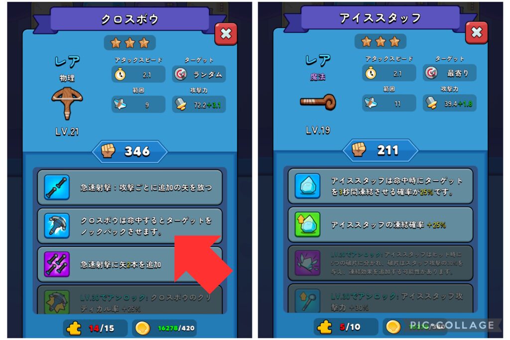 クロスボウとアイススタッフは「レアリティ設定を間違えてるんじゃないの?」というレベルで強力です。相手が自陣に接近しづらくなり、ダメージを受ける機会が激減します。