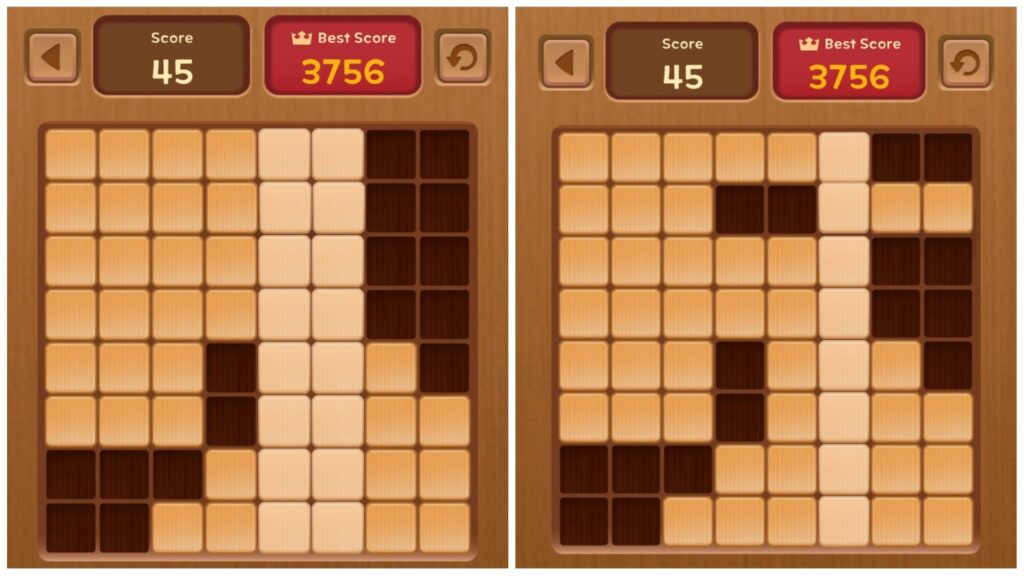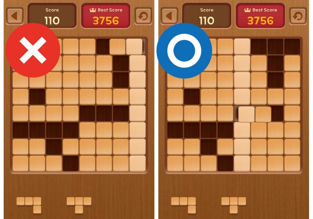 必ず配置できるブロックが出現する仕様を利用してブロックが消えないよう小さいスキマを大量に作って進めるとポイントが伸びる- まとまったスペースが多い時ほど大きなブロックが出現しやすく、小さなスペースしかない場合は小さいブロックが出現する