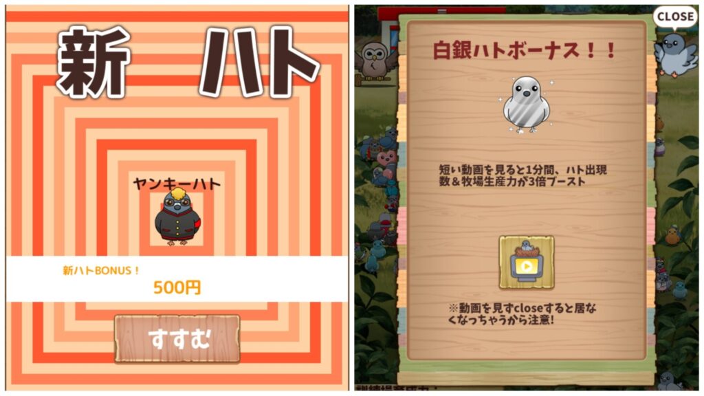 ちなみに、鳩舎をタップしてハトを生産するのが有益なのは、周回開始直後(インストール直後やリセット直後)だけです。