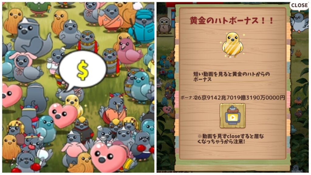 - 黄金のハトボーナスは現在の訓練場育成力の800倍のお金が貰える