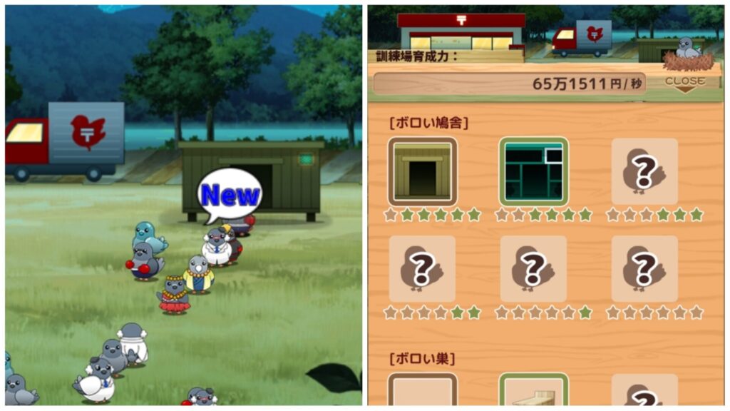 画面右上にある鳩舎(きゅうしゃ)をタップするとハトを生産できます。そして、鳩舎を強化すると、鳩舎タップで生産されるハトの収益性が上がります。