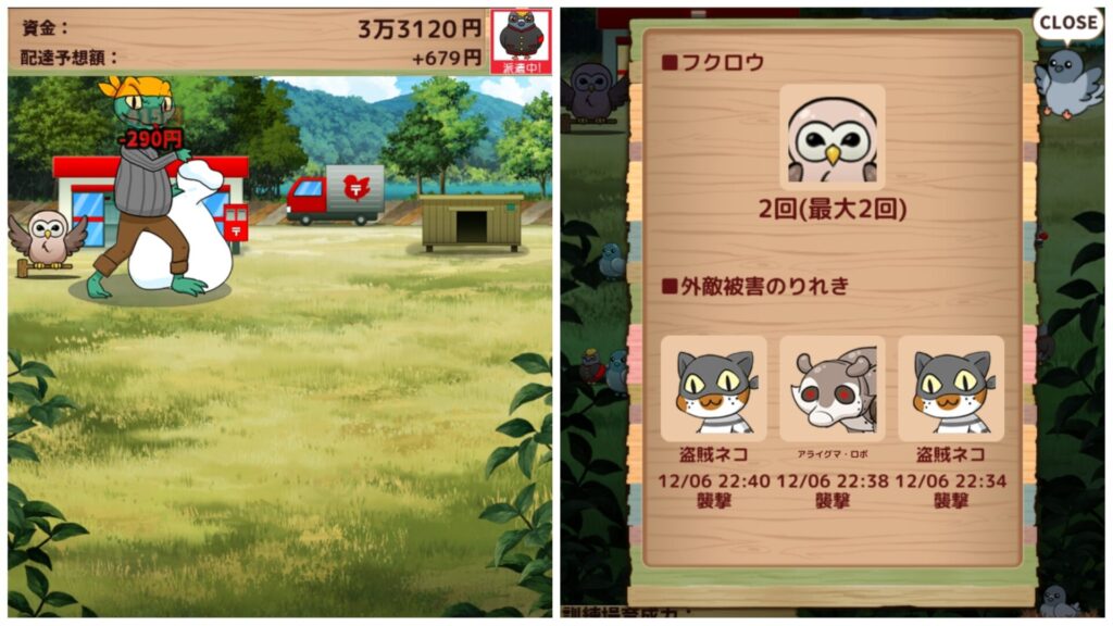 ハト郵便局では間々「外敵」が出現し、外敵を放置すると画面上すべてのハト&配達予想額をゴッソリ持っていかれるので注意が必要です。