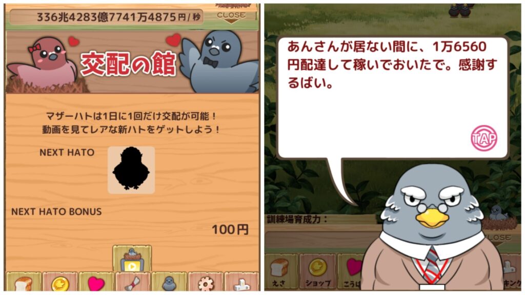 筆者が検証したところ、タップの有無で収益性が変わる事もありませんでした。唯一変わるのは「ハトの成長速度」だけです。