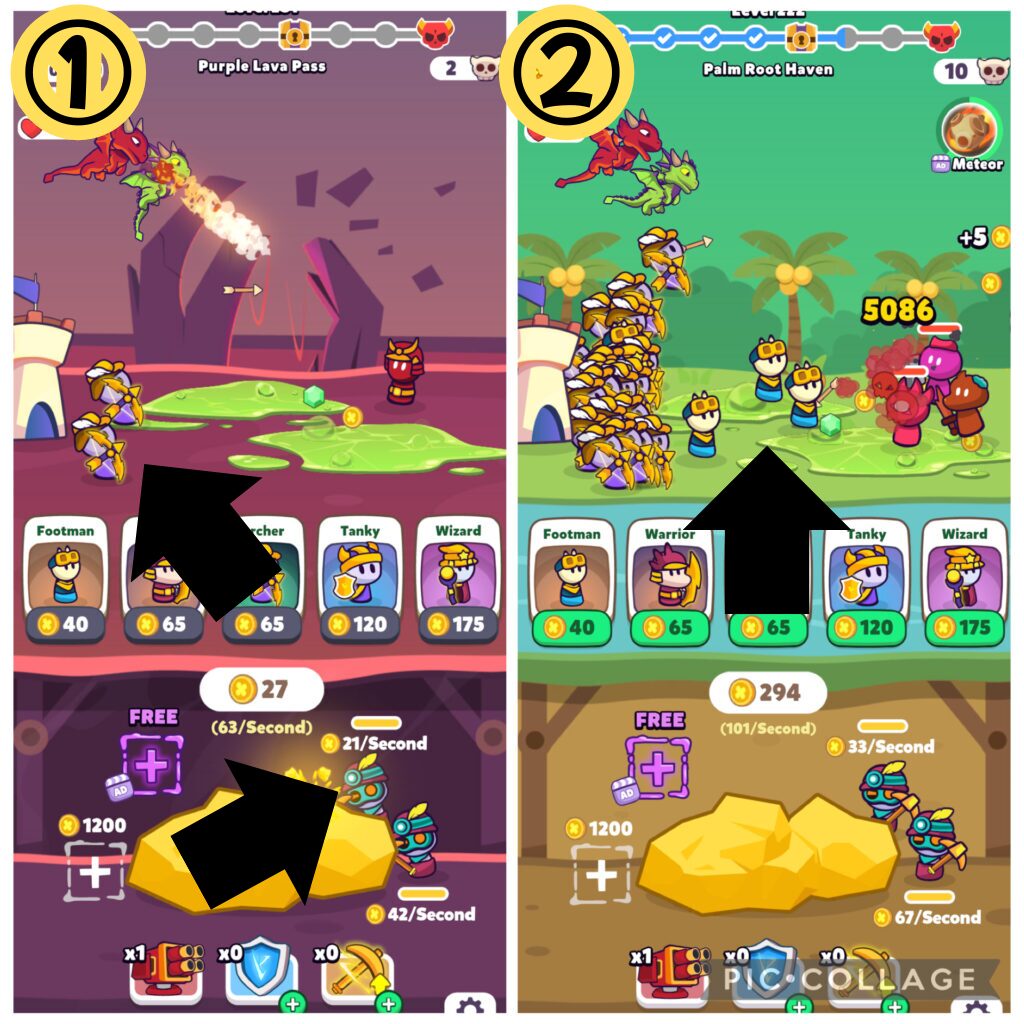 アーチャーのレベルや鉱石生産力が低い序盤は上記の手順が使えませんが、ある程度強化が進むと全ステージ(レベル)上記のテンプレ手順でクリアできます。