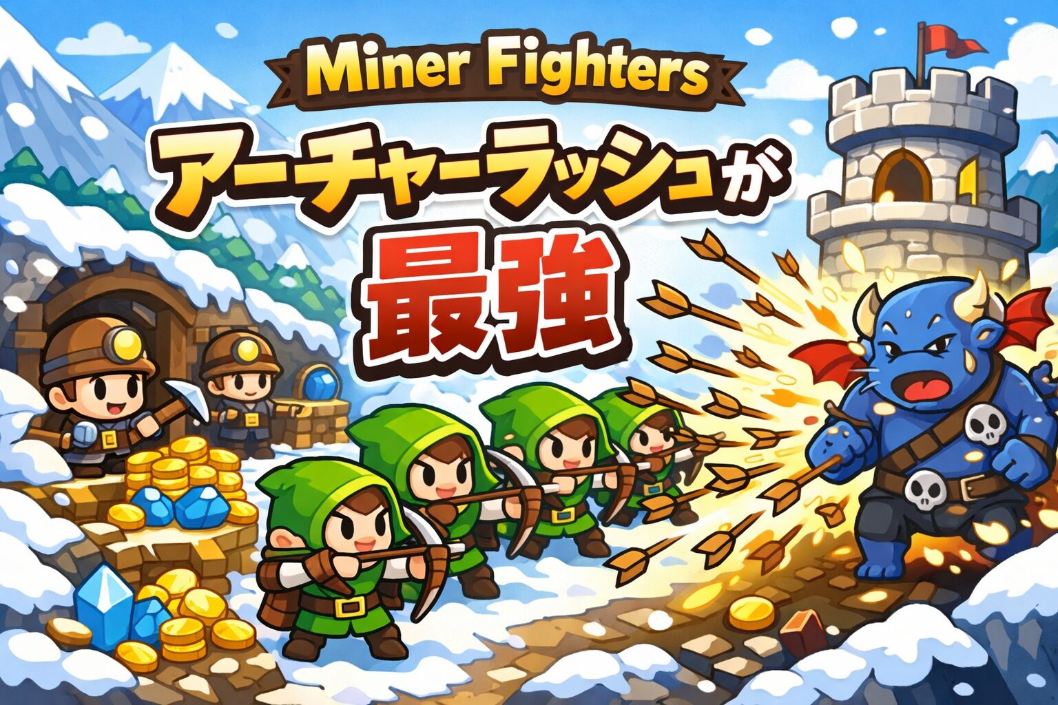 上記画像の左側がバトル画面です。画面下部のマイナーがコインを稼ぎ、稼いだコインでファイターを雇って敵の襲来からタワーを守るゲームです。