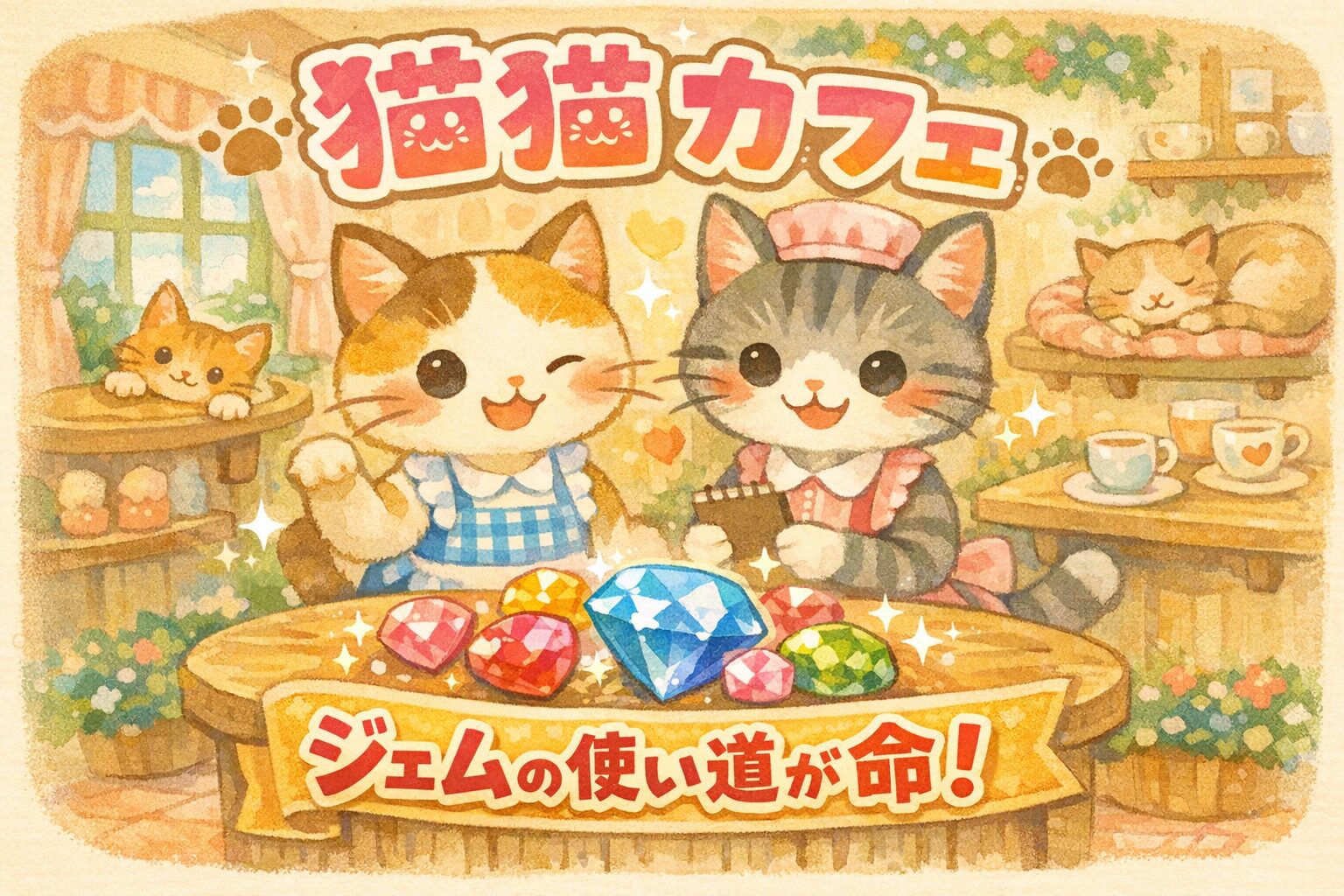 ちなみに、猫猫カフェではログインボーナスやイベントでもジェムが貰えるため、日数をかけて条件の達成を目指す方がプレイ時間は短く済みます。